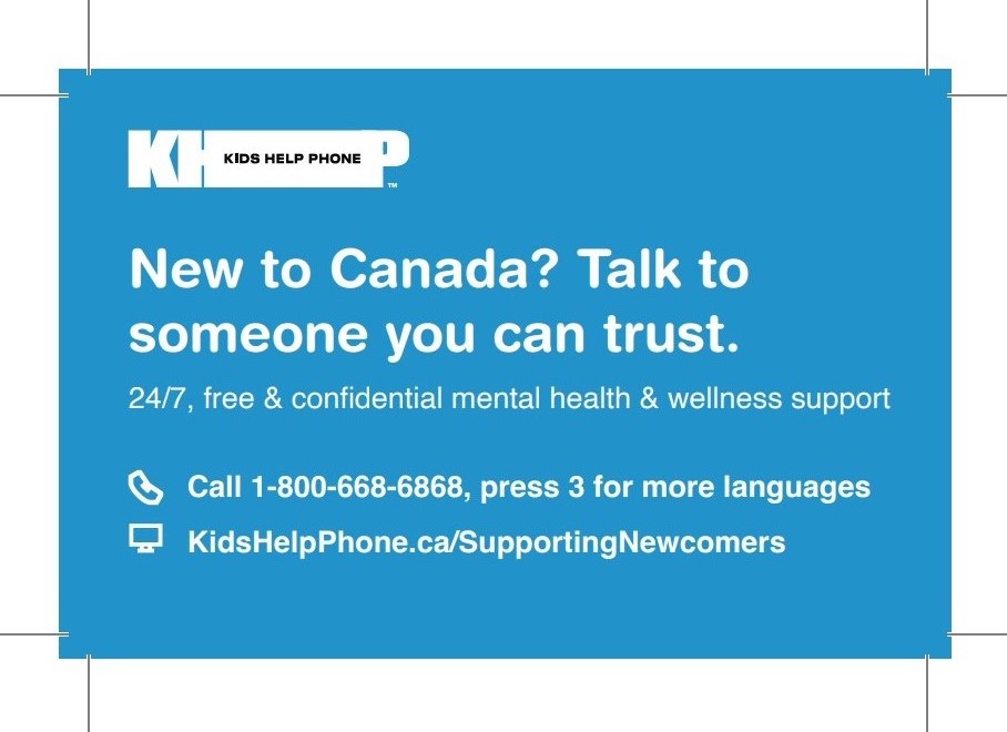 Newcomers and other kids, teens and young adults across Canada can access inclusive support from Kids Help Phone’s professional counsellors (over the phone) and trained crisis responders (through text) 24/7 in English or French. (Our phone service is also offered in Ukrainian, Russian, Pashto, Dari, Mandarin and Arabic with the help of interpreters.) You can learn more about our services here.